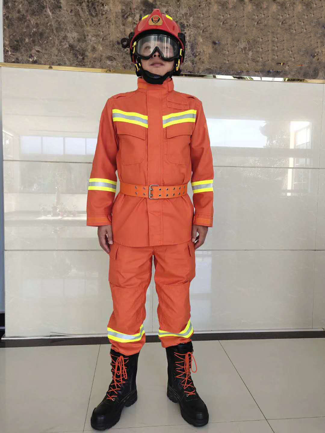 符合GA 633-2006《消防员抢险救援防护服》执行标准制造,符合公安部《17式消防员抢险救援防护服款式标识统型要求(暂行)》的所有要求,采用国际上通用的结构形式,主要面料选用了具有良好防护性能的桔红色面料。采用单层织物为原液染色芳纶,阻燃粘胶纤维等交织而成的双重组织结构组成;具有吸湿排汗、防静电、阻燃、耐磨、轻便、抗拉力强等优点。
