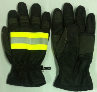 符合GA7-2004《消防手套》标准要求。主要用于手部防护,采用外层、隔热层、防水透气层、衬里四层结构。面料采用芳纶高性能阻燃纤维材料,具备阻燃、防水透气、防静电、舒适等性能。由外层、防水层、隔热层、衬里组成。手背缝合有宽度为不小于50mm的360°反光标志带。整体热防护性能:TPP≥30cal/cm2。耐磨性能>2000,割破力>15.0N,撕破强力≥155N、刺穿力≥75N,穿戴时间≤2s。防水性能:手套连续浸水 24H无渗漏灵巧性能:30S内3次拾取钢棒直径8mm;握紧性能:拉重力比≥96%;外层面料材料:藏青色抗结冰斜纹布。防水层材料:TPU低透乳白防水袋。隔热层面料材料:芳纶毡。